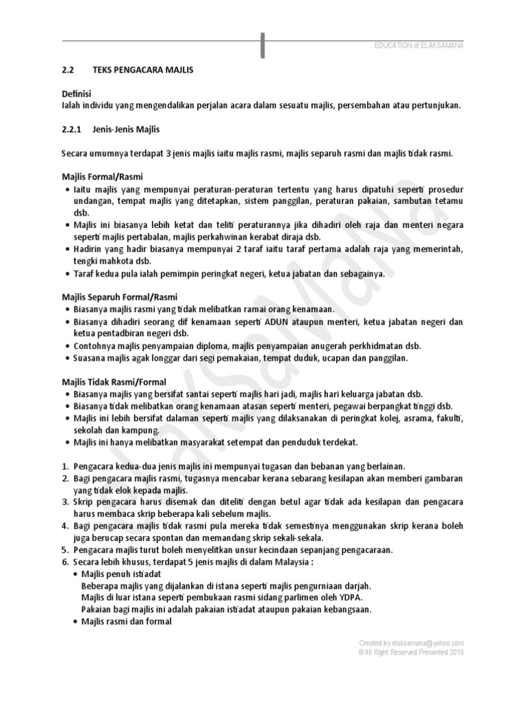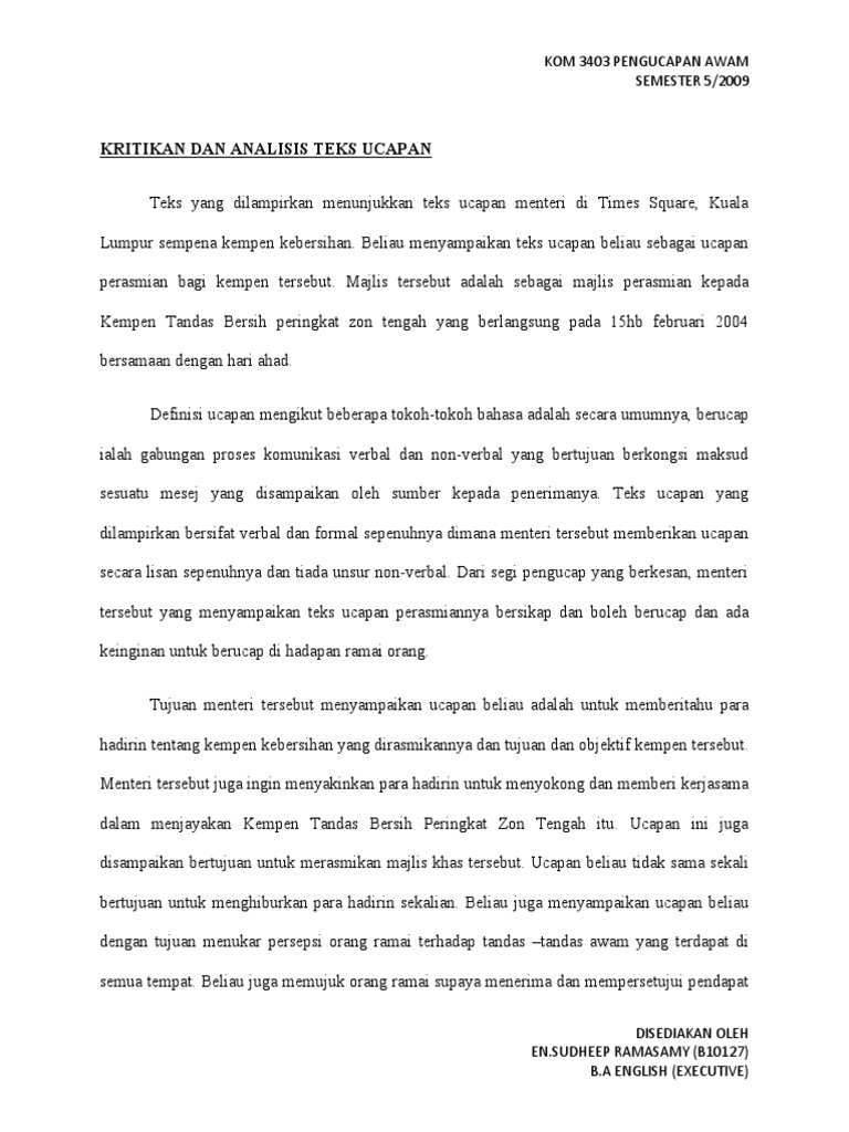 Mc atau master of ceremony selalu menjadi pemandu jalannya acara dari awal hingga akhir. Teks ucapan majlis penetapan target. Namun, kamu harus memahami terlebih dahulu apa itu teks nonfiksi. Selamat pagi/ salam sejahtera untuk kita semua. Sebenarnya teks editorial ini tidak memiliki struktur yang pasti karena pada faktanya teks editorial yang bisa cenderung di tulis dalam bahasa formal sebagai penjelasannya, dan bisa juga non formal dalam lantas darimana datangnya opini? Description flag for inappropriate content. Tidak mengandung prasangka/dugaan/pemihakan yang menyimpang atau tidak tepat. Dalam opini tersebut harus didasari dengan argumen disertai fakta yang mendukung. Informasi teks merupakan hasil penelitian terkini yang sudah terbukti kebenarannya. Mudah digunakan perisian teks ke ucapan dan ucapan ke teks yang menggunakan pengecaman teks berguna untuk ucapan dan ucapan ke teks. B) ucapan tidak rasmimerupakan ucapan yang disampaikan secarabebas tanpa terikat kepada sebarang prosedur.ucapan jenis ini menggunakan bahasa yangmudah , ringkas dan terus kepada maksud,misalnya ucapan dalam majlis hari jadi atau ulangtahun teks pengacara majlis formal. 0%0% found this document useful, mark this document as useful. Teks prosedur kompleks merupakan suatu teks yang menjelaskan bagaimana suatu proses berlangsung yang meliputi proses pengerjaan, proses pengoperasian, proses pembuatan yang sistematis dan tersusun rapi.