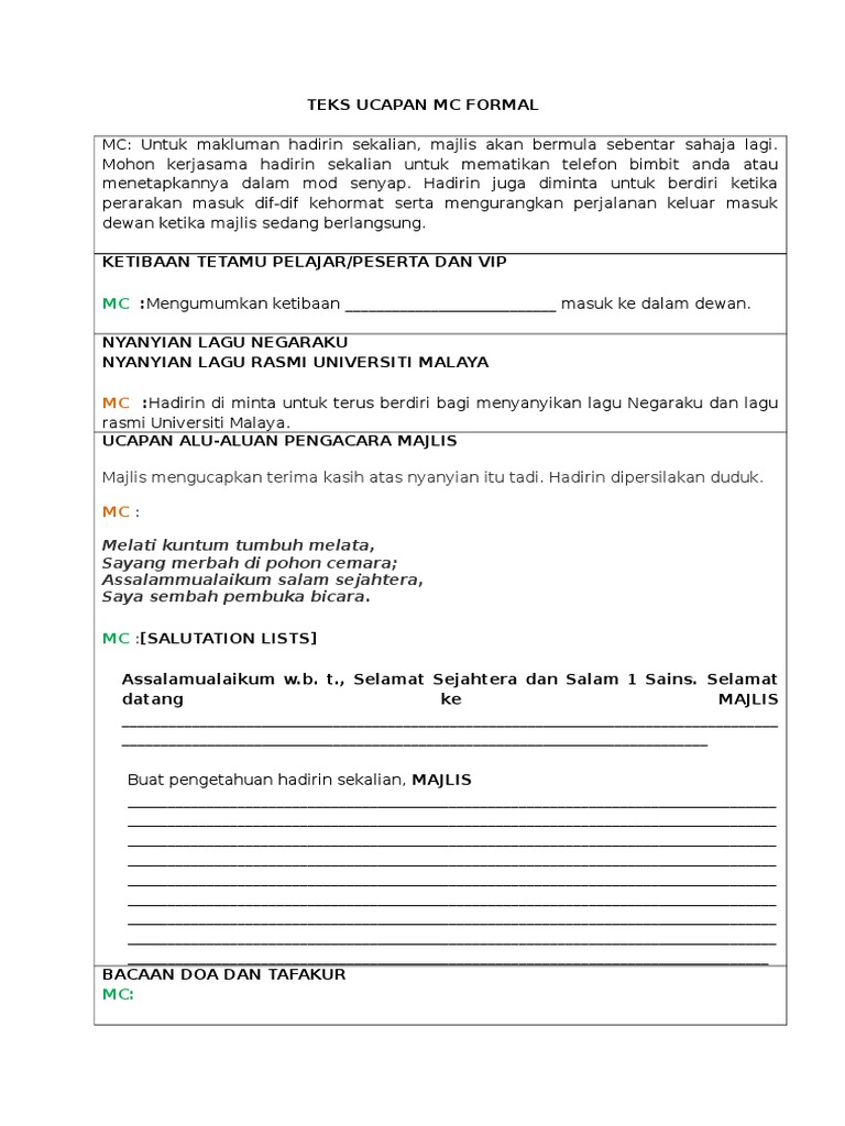Sebenarnya teks editorial ini tidak memiliki struktur yang pasti karena pada faktanya teks editorial yang bisa cenderung di tulis dalam bahasa formal sebagai penjelasannya, dan bisa juga non formal dalam lantas darimana datangnya opini? Teks ucapan majlis penetapan target. Ya memang tugas seorang mc yaitu mengatur atau memandu pelaksanaan sebuah acara, baik itu acara formal, semi formal, ataupun non formal. Tidak tidak lupa saya ingin menyampai menyampaikan kan ucapan. Namun, kamu harus memahami terlebih dahulu apa itu teks nonfiksi. Mc atau master of ceremony selalu menjadi pemandu jalannya acara dari awal hingga akhir. Pelajari materi yang akan disampaikan narasumber walaupun kita tidak paham secara utuh materi 5. Teks ini diklarifikasikan menjadi tiga jenis, yaitu teks yang memuat cara penggunaan alat, benda, atau sejenisnya, teks yang memuat cara melakukan suatu aktivitas, dan. Aplikasi ini menjadikan produktif lebih mudah kami tidak menyimpan apa sahaja yang anda katakan atau taipkan atau data lain mengenai anda. Savesave teks ucapan formal for later. Teks editorial adalah teks yang berisi opini seseorang atau tim terhadap suatu hal yang sedang viral/hangat diperlukan. Contoh teks mc acara peringatan hari nasional. Penjelasan lengkap seputar contoh teks mc formal dan non formal yang baik dan benar.